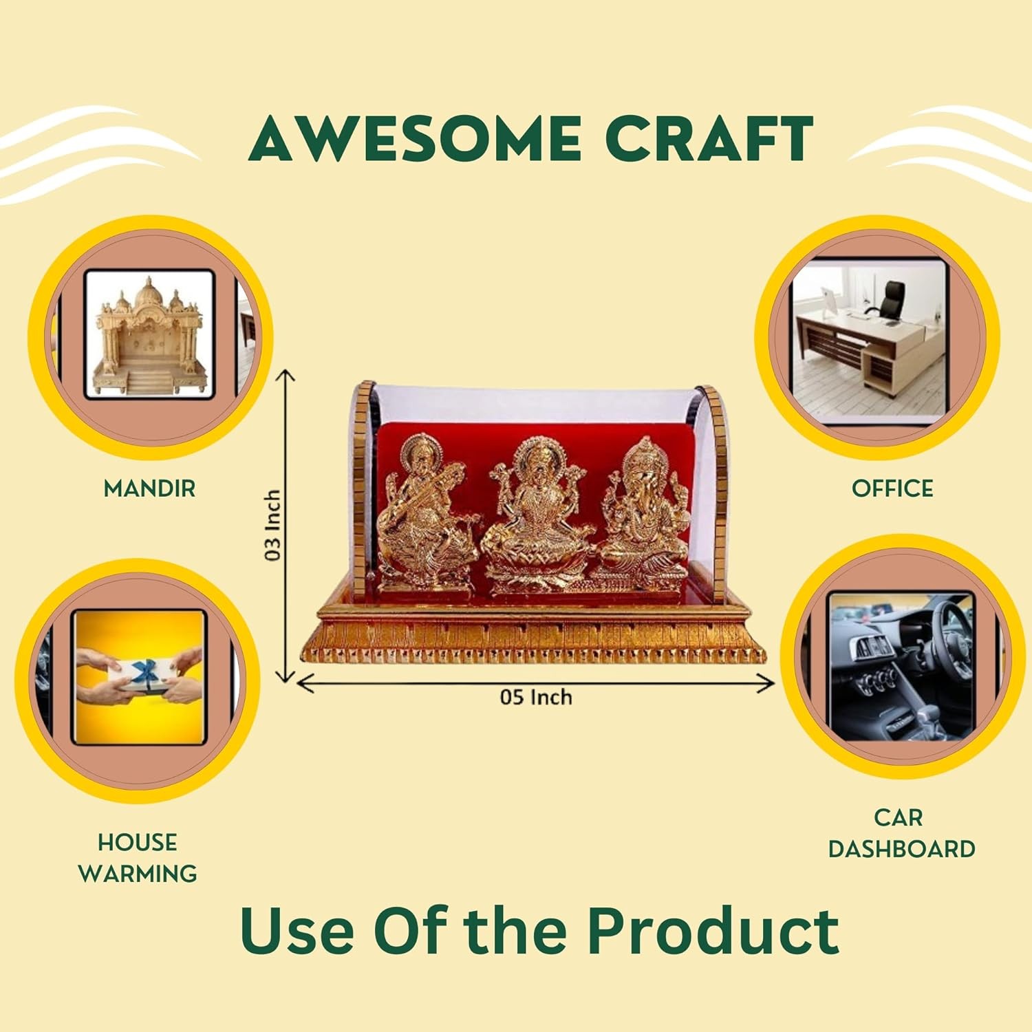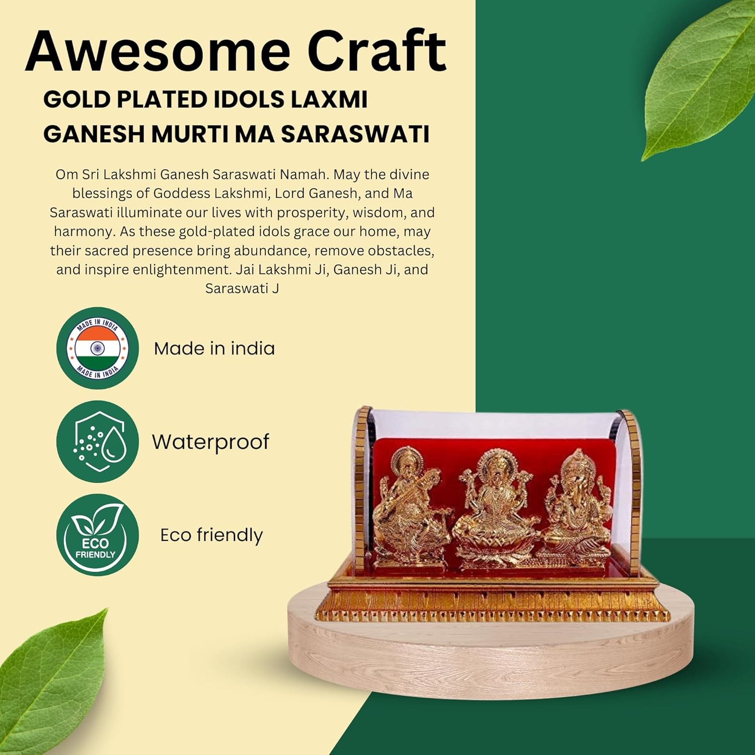 Introducing the Awesome Craft Gold Plated Idols: Enhance the aura of your home decor, pooja room, study table, living room, or office with these exquisite Laxmi Ganesh Murti Ma Saraswati idols. Meticulously crafted with gold plating, these idols exude elegance and spirituality. Perfect as a decorative piece or for religious ceremonies, these idols will add a touch of divinity to any space. Ideal for gifting, this meticulously crafted piece is sure to bring joy and prosperity to your loved ones. Elevate your surroundings with these enchanting gold plated idols.